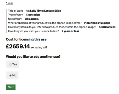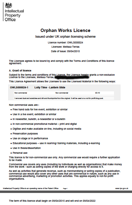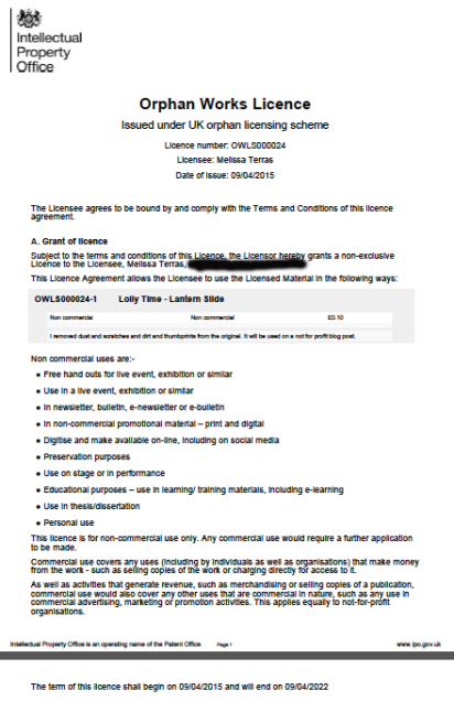 So that brings me to the end of my quest, I think. I’ll continue to engage with the IPO about the licensing number question, and fill you in if there are any changes, but its clear that at the moment, as it stands, the scheme excludes people like me: sole traders, wanting to use orphan works in small print runs. And the scheme is too unwieldy, time consuming, and costly, to allow any more than the odd item to be licensed: those wanting a non-commercial license are better trying to look at the exceptions, first.