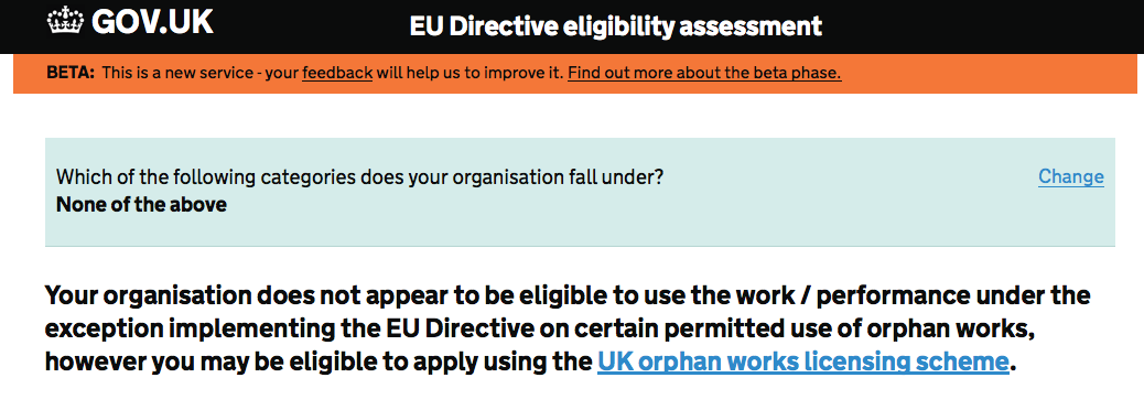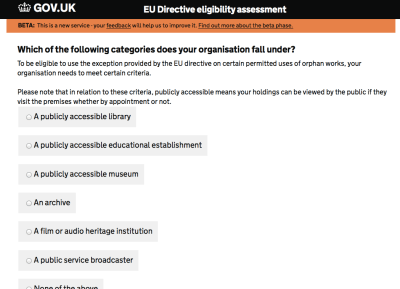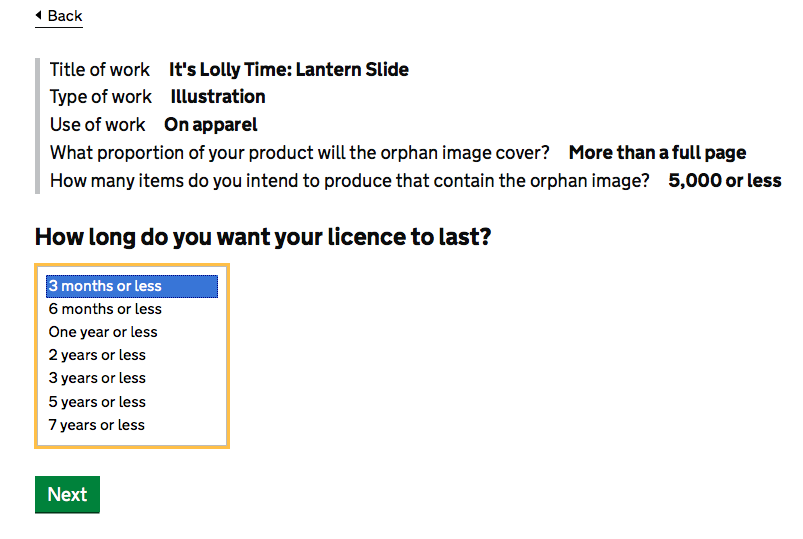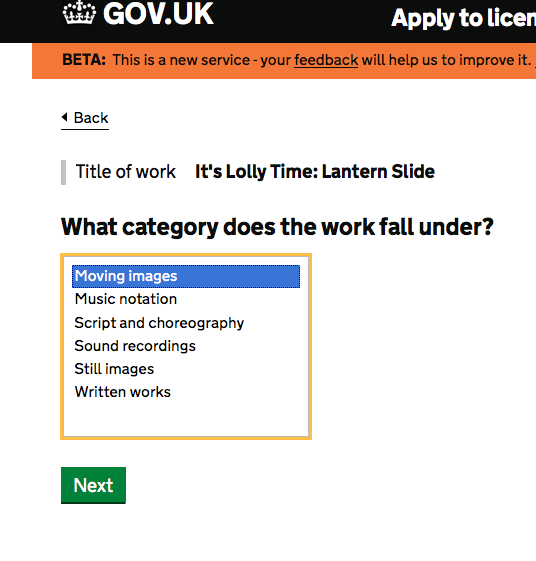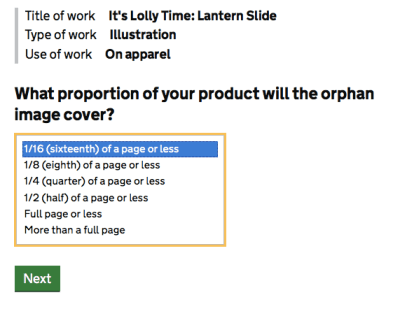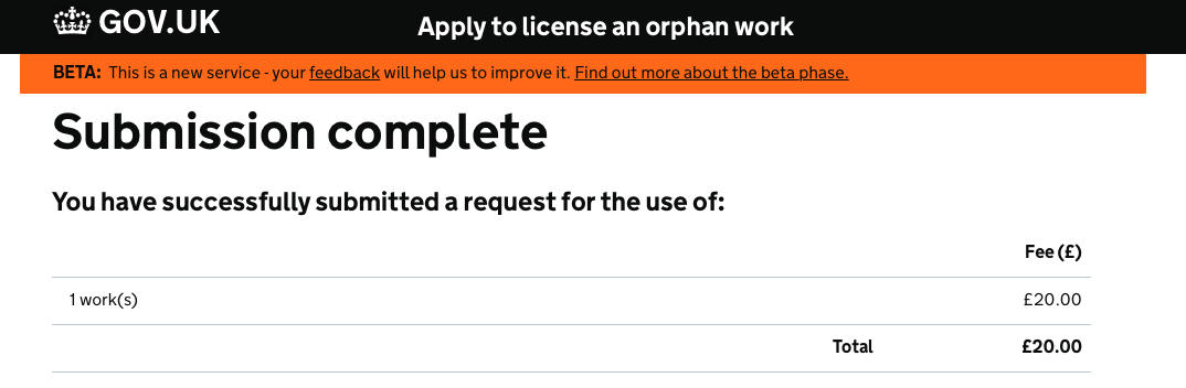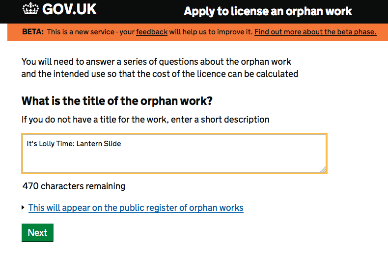 It’s online! Here we have the process and the system of how to apply for a license for an orphan work. It’s an online form – I’ll get cracking with it…