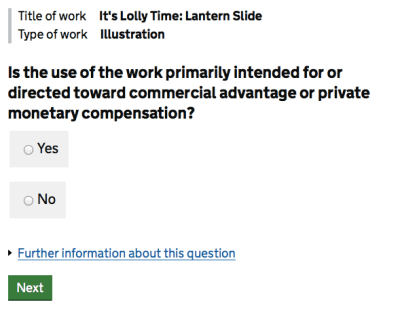 Of course, we could go back to the start of the process, and I could decide that I’d make things and donate any profits back to the NLS, in which case I would check the no commercial gain box. The process (and costs) are then significantly reduced: